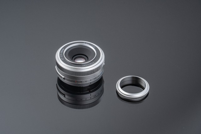 Součástí balení je navíc miniaturní stříbrná sluneční clona, malá kovová součástka, která slouží také k ochraně předního členu objektivu, podobně jako u modelu Fujinon XF 27mm.
