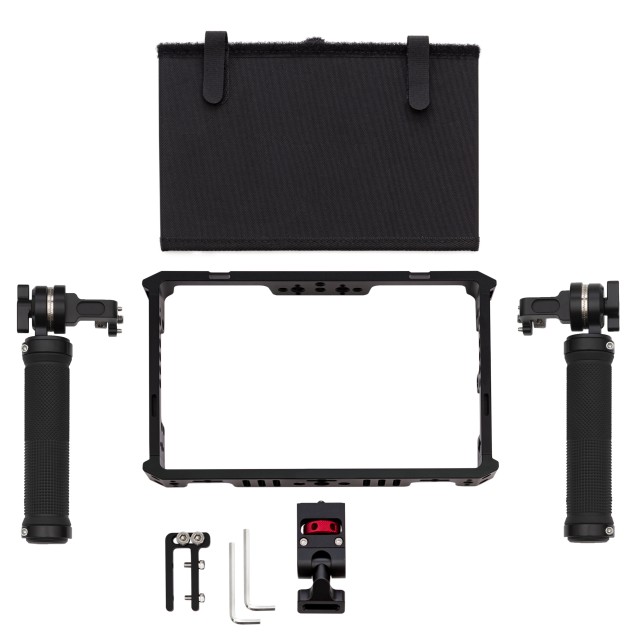 Hliníková klec pro 7“ monitory TVLogic F-7H/M2/F-7HS vč. dvojice madel (ARRI rozeta) a sluneční clony. Klec dále nabízí několik 1/4”-20 a 3/8”-16 závitů pro další příslušenství, průvlaky pro instalaci poutka/popruhu a držák HDMI kabelu...