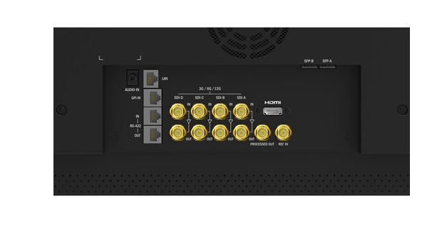 | Vstupy monitoru | 4 × 12G-SDI Inputs 4 × 12G-SDI Loop Outputs Quad-Link 3G-SDI Input/Output 1 × HDMI 2.0 Input 1 × Reference Input 2 × SFP Slots |