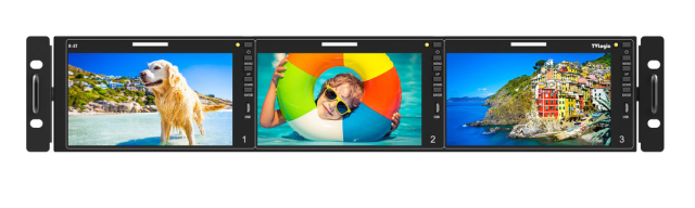 Tři 5,5" Full HD 1920 x 1080 LCD monitory v konfiguraci pro montáž do racku 2U