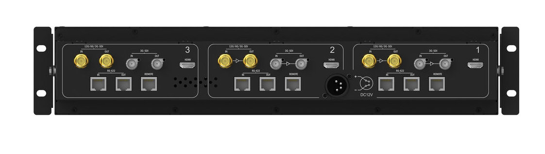 Video I/O: 3x BNC 12G-SDI vstup, 3x BNC 3G-SDI vstup, 3x HDMI vstup; 3x BNC 12G-SDI výstup, 3x BNC 3G-SDI výstup