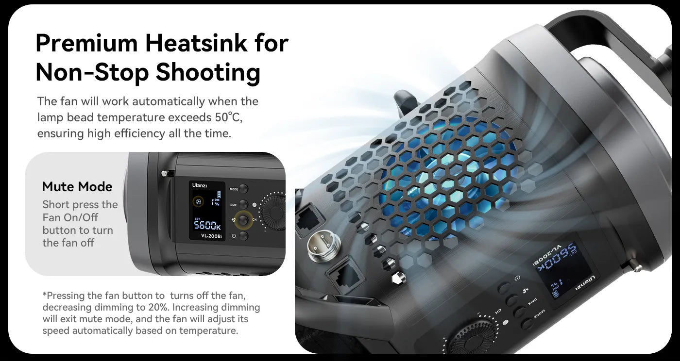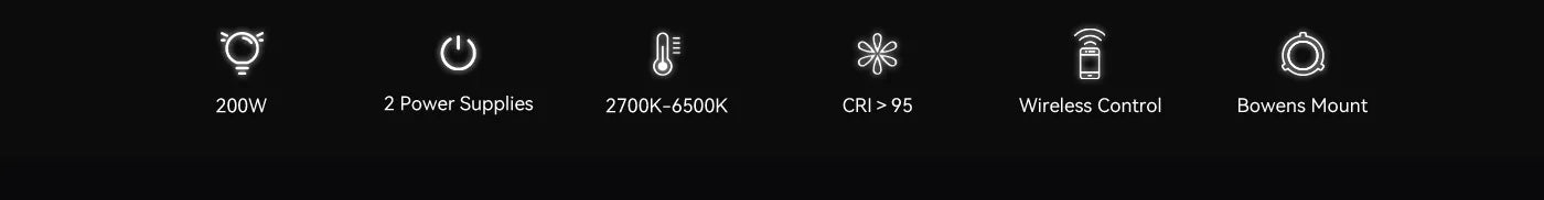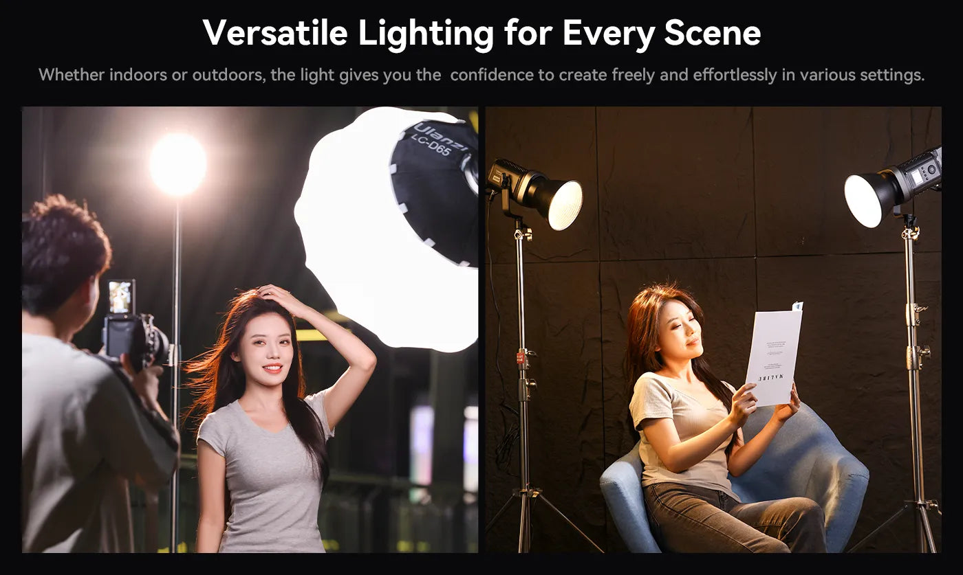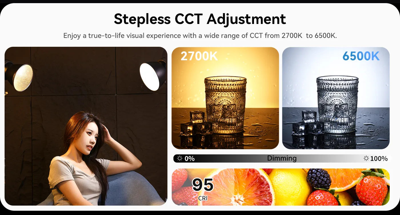 Díky dvojímu napájení můžete použít baterii V-mount pro mobilitu venku nebo napájecí adaptér DC pro stabilní použití uvnitř. Nastavte barevnou teplotu plynule od 2700 K do 6500 K (CRI>95) a ztlumte od 0 % do 100 %. Prémiový chladič zajišťuje nepřetržité natáčení s automatickým ventilátorem a tichým režimem pro tichý provoz.