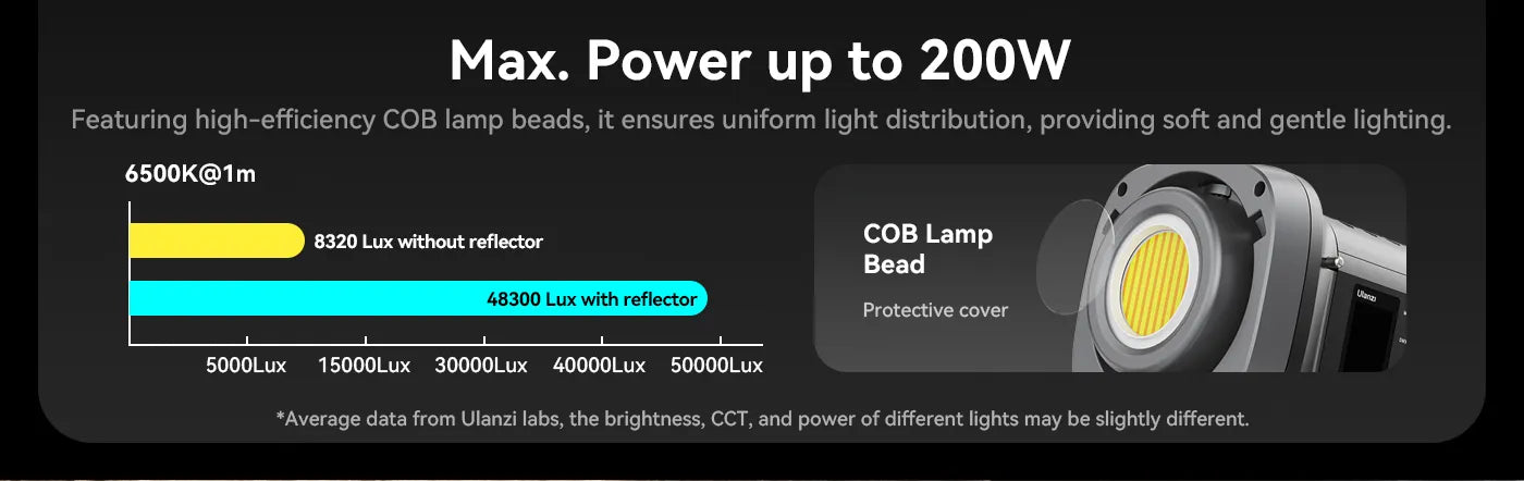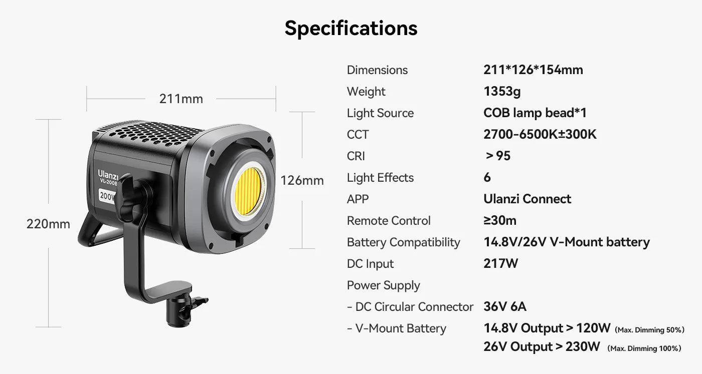 Video světlo Ulanzi VL-200Bi 200W V-Mount nabízí univerzální osvětlení pro každou scénu, ideální pro svatební videografie, skečová videa, živé vysílání e-commerce a produktovou fotografii. Díky vysoce účinným COB lampám poskytuje rovnoměrné, měkké osvětlení s výkonem 48300 luxů při 6500K@1m s reflektorem.