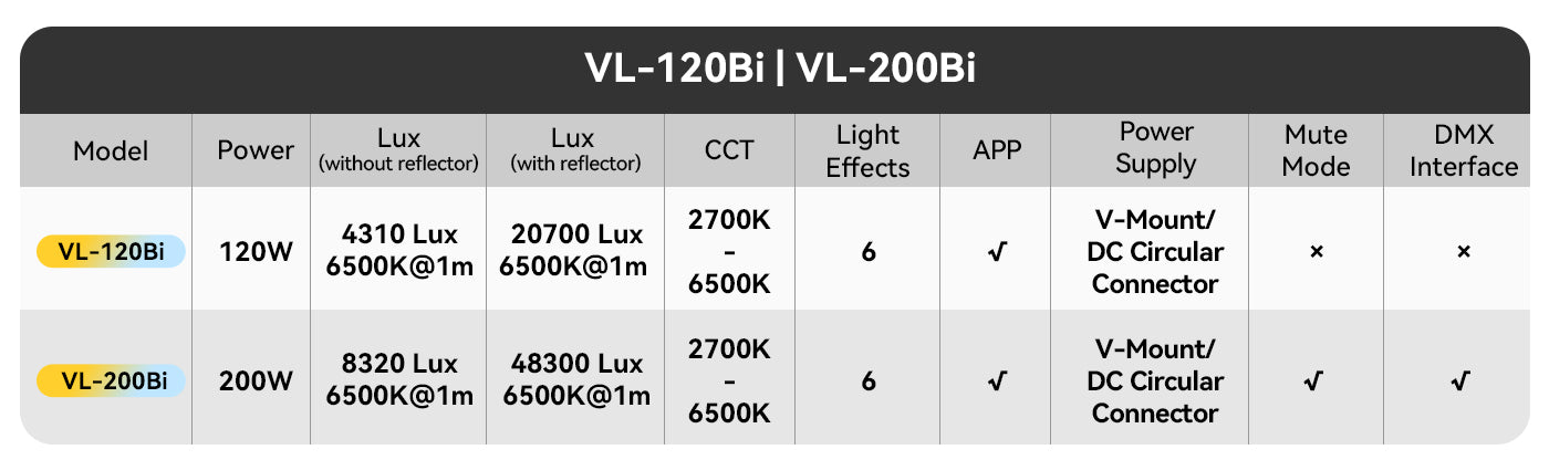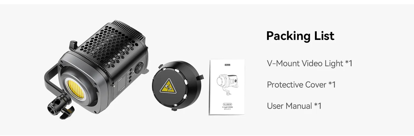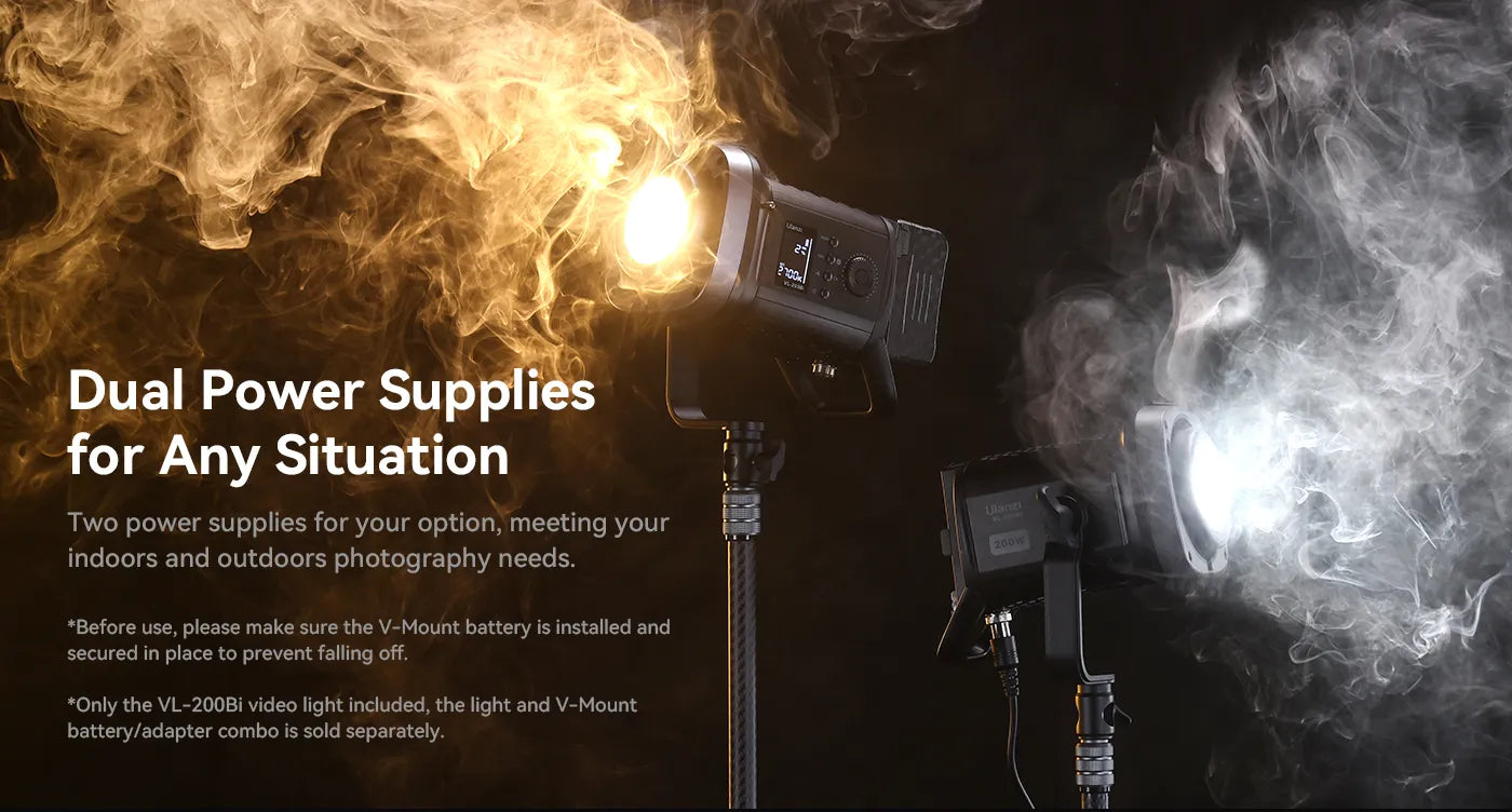 - Světla VL-200Bi se prodávají samostatně od kombinací baterií/adaptérů V-Mount.