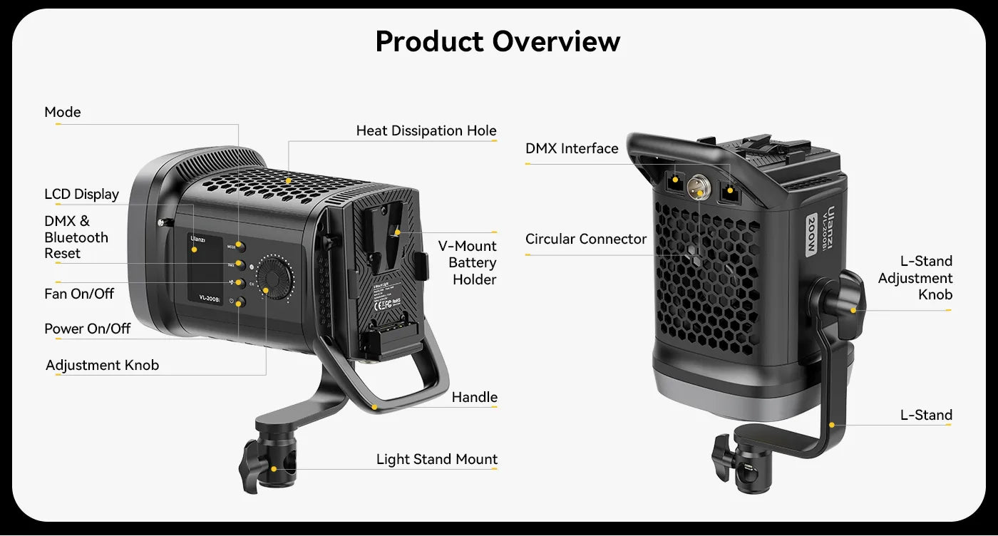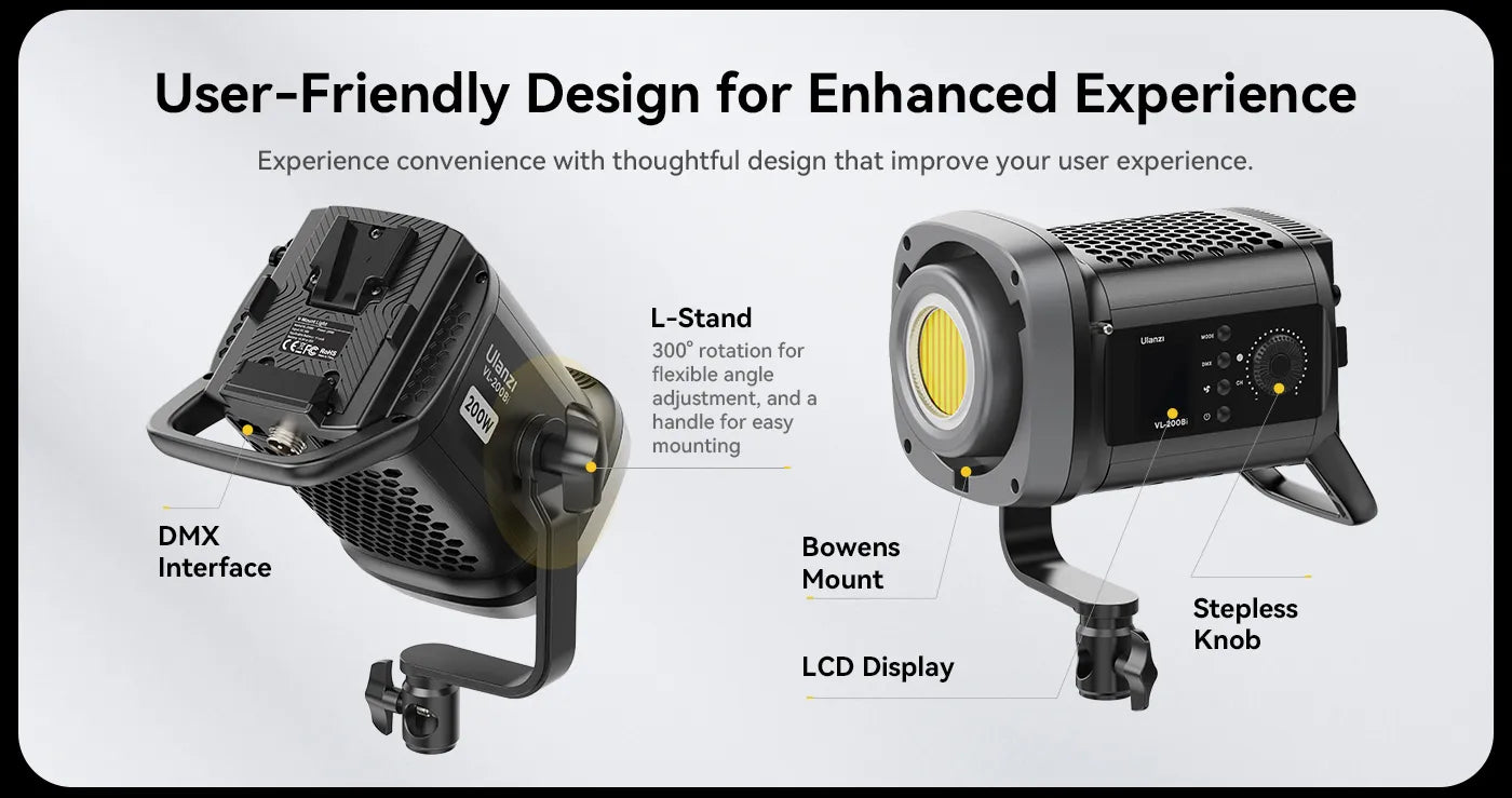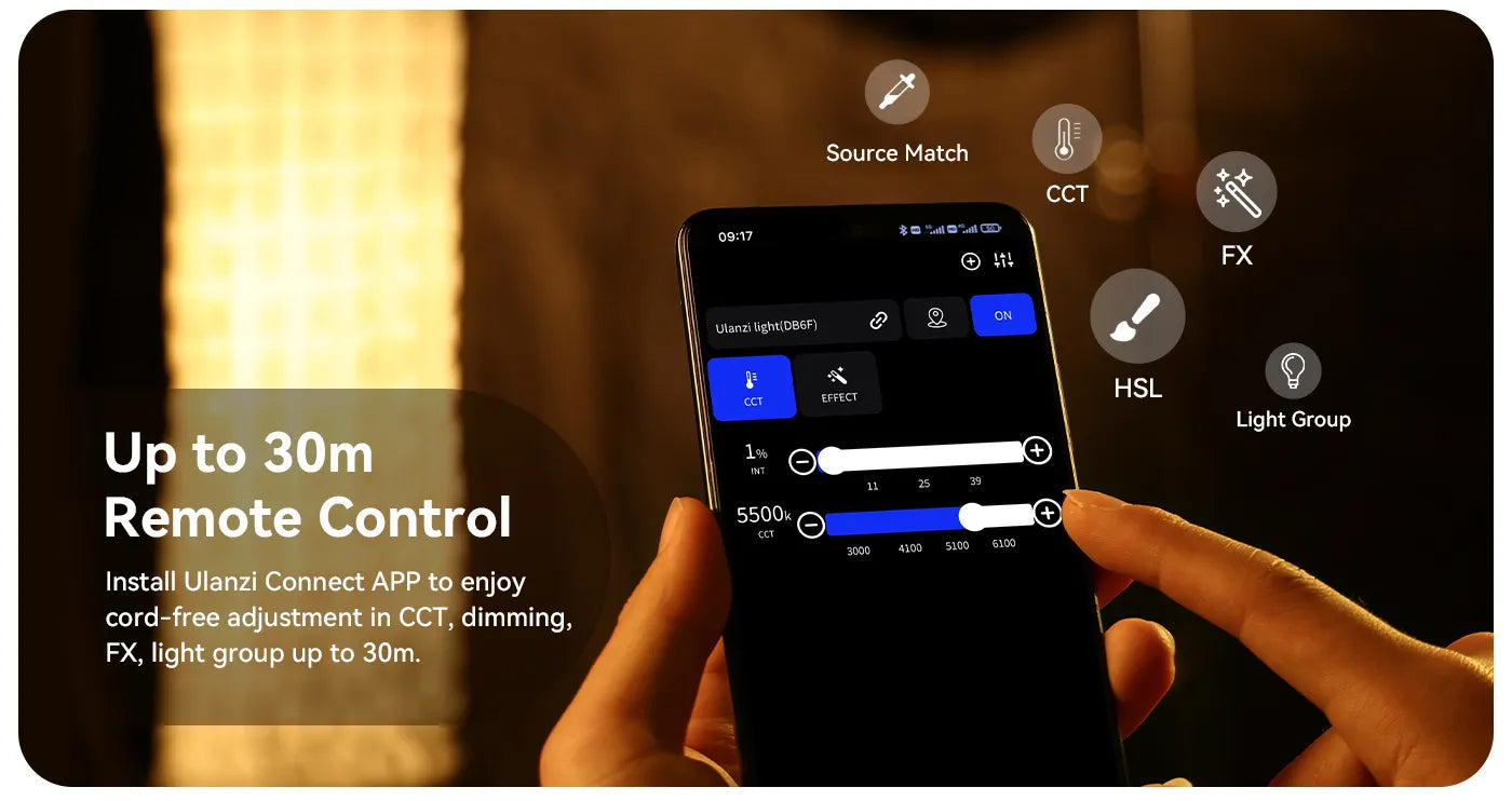 Ovládejte osvětlení až na vzdálenost 30 m pomocí aplikace Ulanzi Connect. Uživatelsky přívětivý design zahrnuje LCD displej, plynulý ovladač, otočný L-stativ o 300°, držák Bowens a rozhraní DMX pro ovládání více světel.