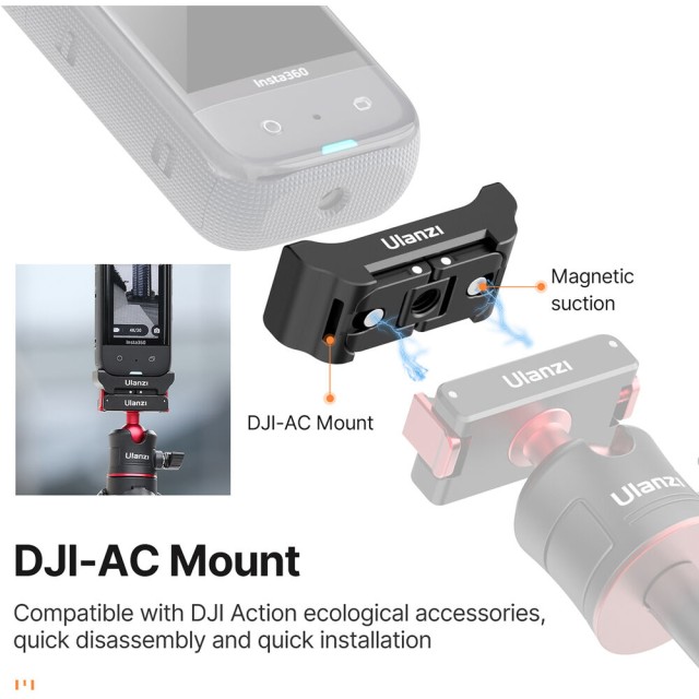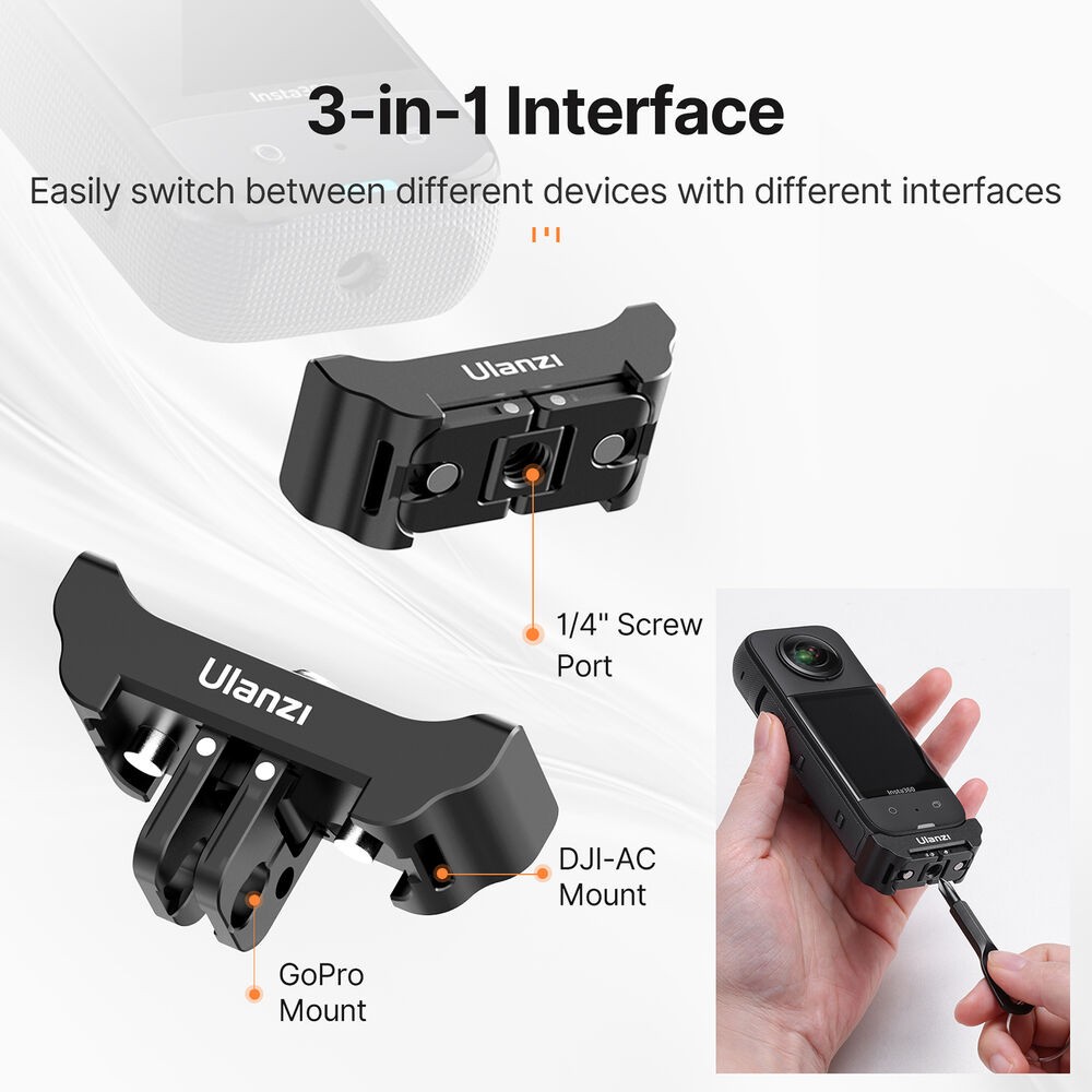 Adaptér Ulanzi 3 v 1 s rychlým uvolňováním vám umožní rychle a bezpečně připevnit akční kameru Insta360 X3 nebo X2 na stativy, rigy nebo magnetické příslušenství DJI. Tento kompaktní adaptér s sklopným 2kolíkovým držákem, závitem 1/4"-20 a magnetickým držákem DJI kombinuje univerzálnost, odolnost a ochranu vaší kamery.