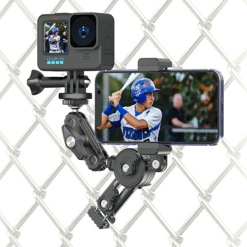 Ulanzi Baseball Fence Mount je držák pro dvě zařízení, který se bezpečně připevní na plot z drátěného pletiva a umožňuje vám nahrávat zápasy nebo tréninky pomocí akční kamery a smartphonu vedle sebe. Díky kulové hlavě, nastavitelné svorkě na telefon a odolné konstrukci je ideální pro zachycení více úhlů z okraje hřiště.