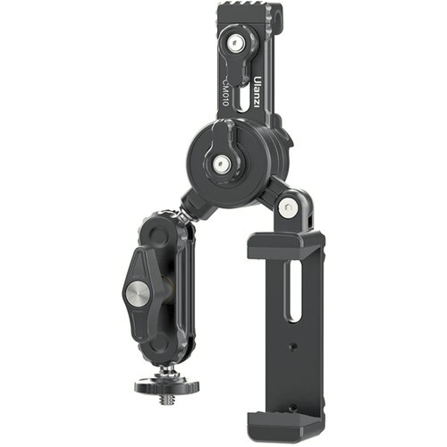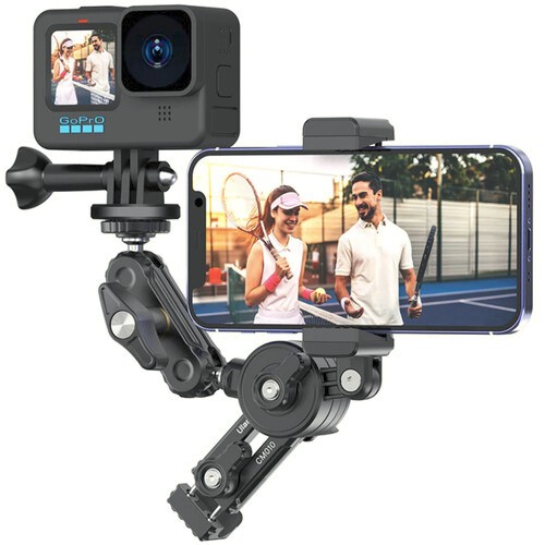 Držák se bezpečně upíná na standardní pletivo a má celkovou nosnost 900 g. Jedno rameno je vybaveno kulovou hlavou se šroubem 1/4"-20, která umožňuje otáčení o 360° pro přesné nastavení polohy kamery, zatímco přiložený dvoubodový adaptér pro akční kamery zajišťuje kompatibilitu s kamerami typu GoPro. Druhé rameno obsahuje nastavitelnou svorku pro smartphony, která se hodí pro telefony o šířce až 3,3", s nastavením naklonění ze strany na stranu pro optimální rámování.