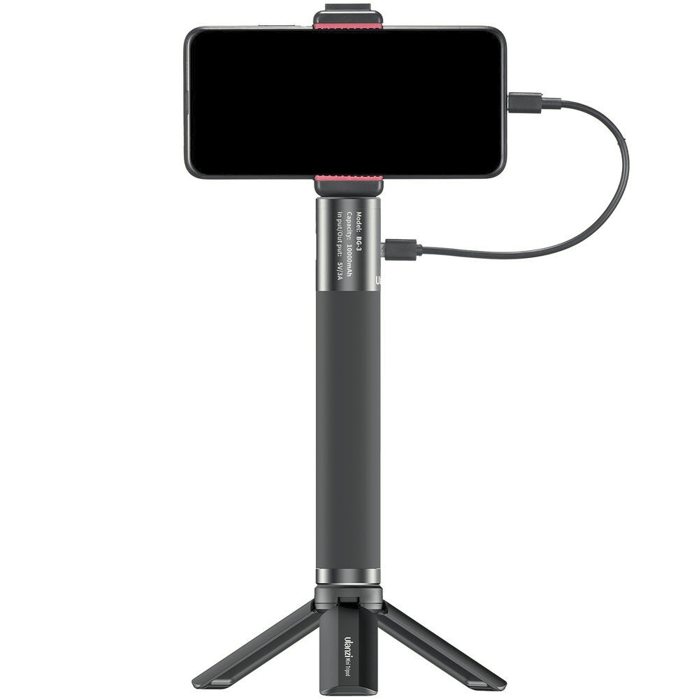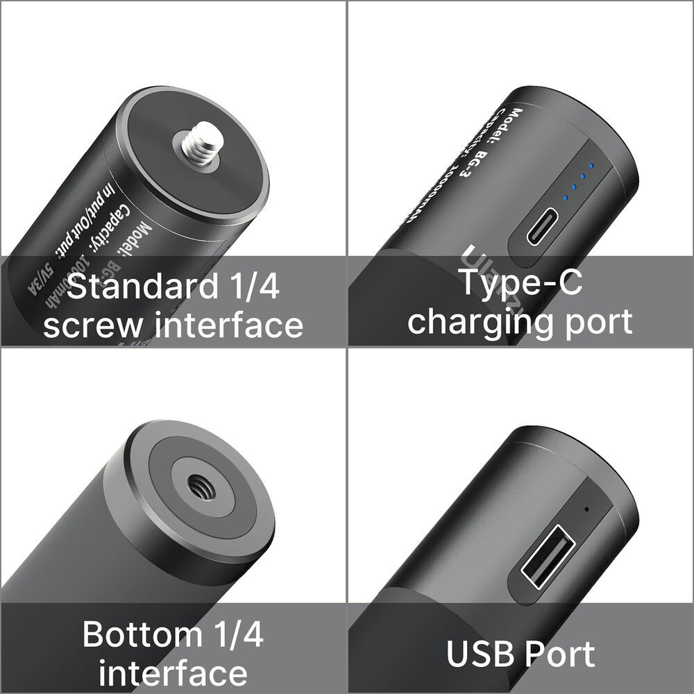 V horní části BG-3 se nachází montážní šroub 1/4"-20, který umožňuje připevnit akční kamery, kompaktní bezzrcadlovky, držáky telefonů, LED světla, mikrofony a další příslušenství. Pro statické fotografování lze na závit 1/4"-20 ve spodní části připevnit mini stativ, který rukojeť promění ve stabilní stativ pro časosběrné fotografování, vlogování nebo stolní snímky. LED indikátory zobrazují stav baterie a nabíjení, zatímco duální USB porty umožňují současné nabíjení a používání zařízení. Lehký, univerzální a kompaktní BG-3 je nezbytností pro tvůrce mobilního obsahu.