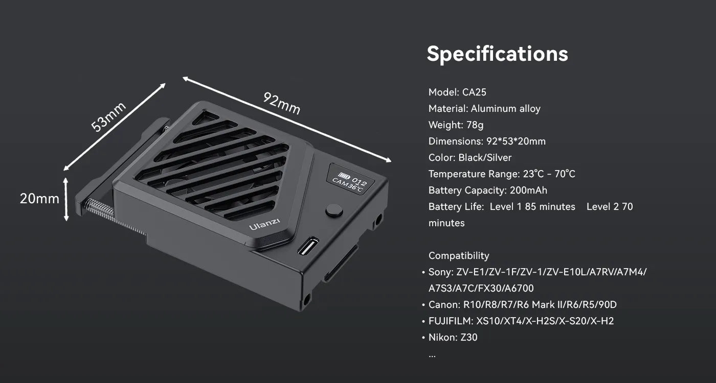 Chladicí ventilátor pro fotoaparáty Ulanzi CA25 je skvělá investice, zejména v letních měsících, kdy se fotoaparáty při delším používání snadno přehřívají. Je navržen pro fotoaparáty Sony, Canon a FUJIFILM a účinně zabraňuje přehřívání, takže váš fotoaparát podává nejlepší výkon i v horkých podmínkách. Je to nezbytné příslušenství pro udržení optimálního výkonu a zabránění potenciálním problémům způsobeným nadměrným zahříváním během fotografování. Kompatibilní s fotoaparáty jako Sony ZV-E1/ZV-1F/ZV-1/ZV-E10L/a7RV/a7 IV (A7M4)/a7S III (A7S3)/A7C/FX30/A6700, Canon R10/R8/R7/R6 Mark II/R5/90D, FUJIFILM XS10/XT4/X-H2S/X-S20/X-H2, Nikon Z30 a další.