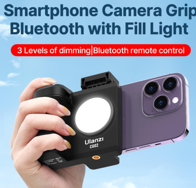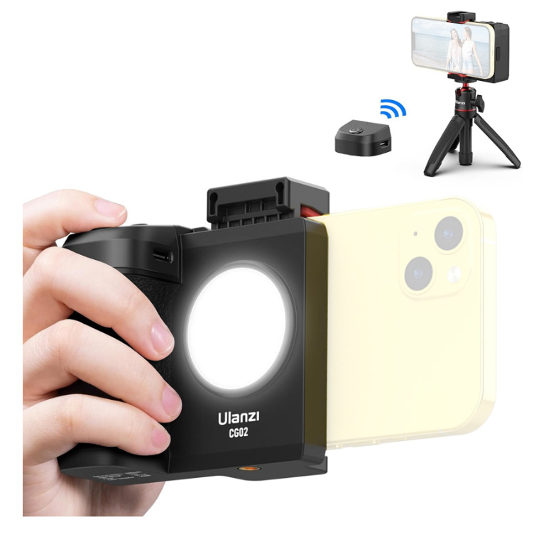 Držák na fotoaparát pro smartphone Ulanzi CG-02 je univerzální ruční držák s vestavěným doplňkovým světlem a dálkovým ovládáním přes Bluetooth. Je navržen pro fotografování jednou rukou a zlepšuje stabilitu, osvětlení a ovládání, což ho činí ideálním pro vlogování, živé vysílání a mobilní fotografování.