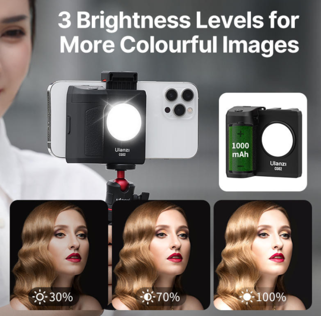 Držák fotoaparátu pro smartphone Ulanzi 3282B CG-02 je kompaktní všestranné řešení pro tvůrce obsahu na smartphonech, kteří chtějí lepší osvětlení, stabilitu a kontrolu v jakémkoli prostředí. Díky integrovanému doplňkovému světlu na horní straně zajišťuje CG-02 jasné a vysoce kvalitní snímky i za zhoršených světelných podmínek. Doplňkové světlo nabízí tři nastavitelné úrovně jasu, což vám umožňuje jemně doladit osvětlení pro portréty, vlogy a videohovory.