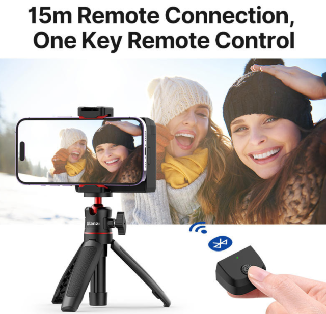 Pro větší pohodlí je držák vybaven odnímatelným dálkovým ovládáním Bluetooth s bezdrátovým dosahem až 15 metrů. Okamžitě se připojí k většině smartphonů bez nutnosti stahování aplikací, což usnadňuje pořizování fotografií nebo spouštění nahrávání na dálku. Ergonomicky tvarovaná rukojeť s měkkým silikonovým povrchem poskytuje zvýšenou stabilitu a odolnost proti otřesům, přičemž zůstává pohodlná i při delším používání jednou rukou.