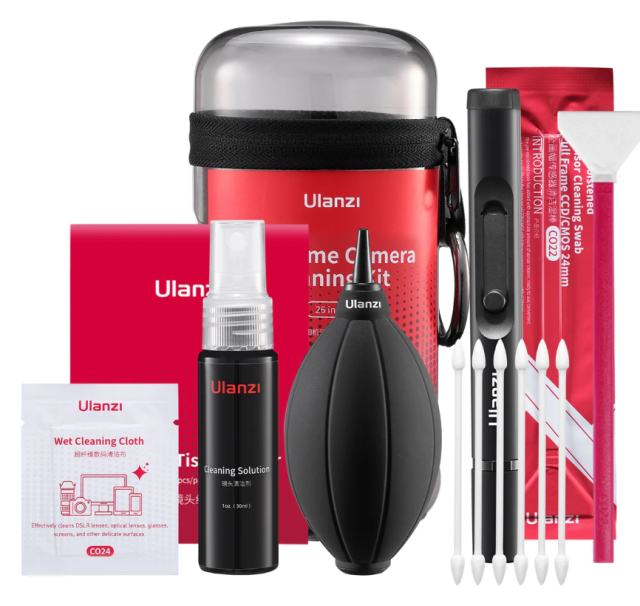 Sada na čištění fotoaparátů Ulanzi CO28 26 v 1 je kompletní řešení pro čištění full-frame fotoaparátů a přesné optiky. Obsahuje 26 nezbytných nástrojů v kompaktním pouzdře a bezpečně odstraňuje prach, otisky prstů, šmouhy a skvrny od vody – ideální pro fotografy a tvůrce na cestách.
