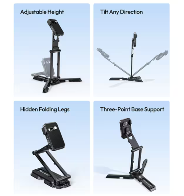 Stojan podporuje plnou 360° rotaci s plynulým tlumení, což umožňuje přesné rámování a rychlé změny úhlu. Navíc jeho víceosý systém nastavení (rozsah otáčení 210°, 350°, 210°, 360°, 120°) dává uživatelům úplnou kontrolu nad polohováním, což jej činí ideálním pro dynamická prostředí natáčení, stolní sestavy a kreativní kompozice.