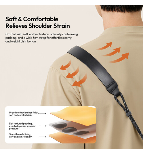 Díky odolným pleteným šňůrám, zesíleným švům a kovovým upevňovacím smyčkám poskytuje CSS2 spolehlivou oporu pro fotoaparáty a vybavení. Jeho nastavitelný design umožňuje uživatelům přizpůsobit si nošení různým stylům, ať už přes rameno nebo kolem krku.