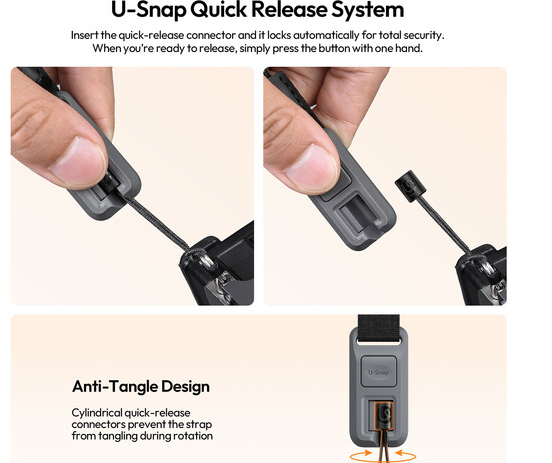 Popruh je vybaven systémem rychlého uvolnění U-Snap, který zajišťuje rychlé a bezpečné připevnění – stačí zasunout konektor a ten se automaticky zajistí. V případě potřeby lze fotoaparát okamžitě odpojit stisknutím tlačítka jednou rukou, což je ideální pro dynamické fotografické podmínky.