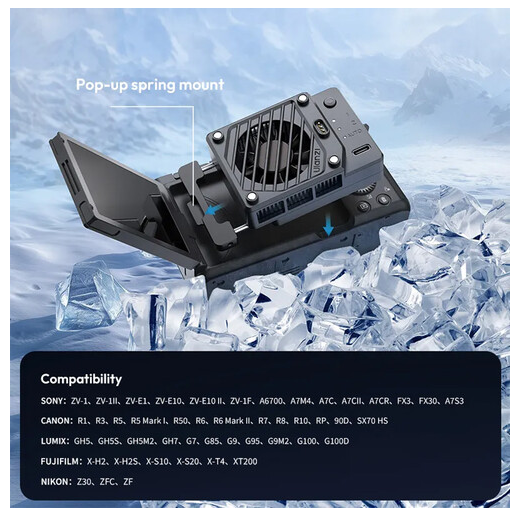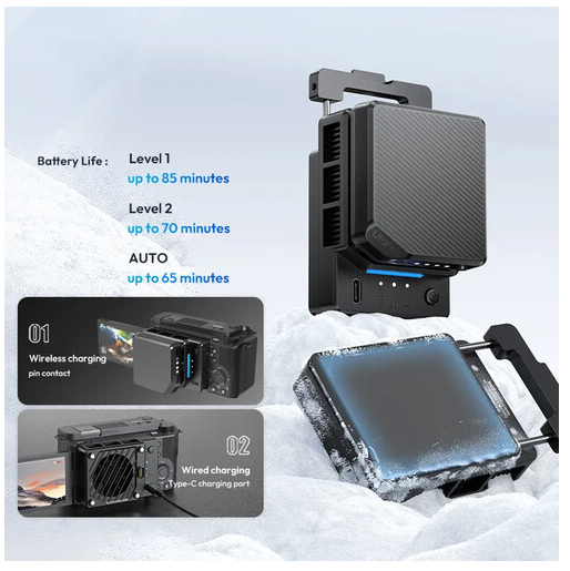 Termostatický polovodičový chladič kamery Ulanzi CU01 s baterií je kompaktní chladicí řešení určené k prevenci přehřátí kamer s výklopným displejem. Díky inteligentní regulaci teploty, vysokorychlostnímu chladicímu ventilátoru a odnímatelné magnetické baterii s kapacitou 3000 mAh zajišťuje stabilní výkon během delších natáčecích relací.