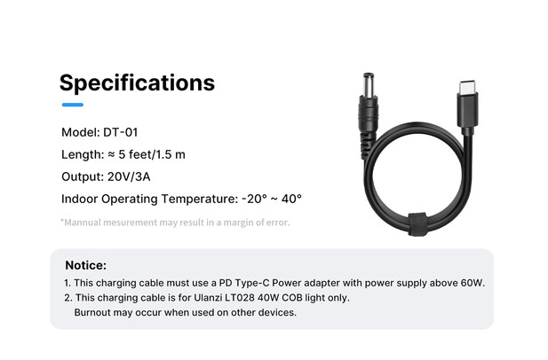 Napájecí kabel Ulanzi L082GBB1 DC na USB-C je spolehlivým řešením pro napájení vašeho dvoubarevného LED monolightu Ulanzi LT028. Tento kabel o délce 1,5 m je na jednom konci vybaven konektorem USB-C a na druhém konektorem DC, díky čemuž je kompatibilní s powerbankami nebo adaptéry USB-C. S jmenovitým výkonem 60 W a výstupem 20 V, 3 A poskytuje kabel potřebný výkon pro monolight LT028 a zajišťuje konzistentní výkon během natáčení. Ať už pracujete na místě nebo ve studiu, tento napájecí kabel nabízí flexibilitu, protože umožňuje připojit LED světlo k různým zdrojům napájení. Je to nezbytné příslušenství pro fotografy a kameramany, kteří potřebují přenosné a pohodlné řešení napájení pro své osvětlovací zařízení.