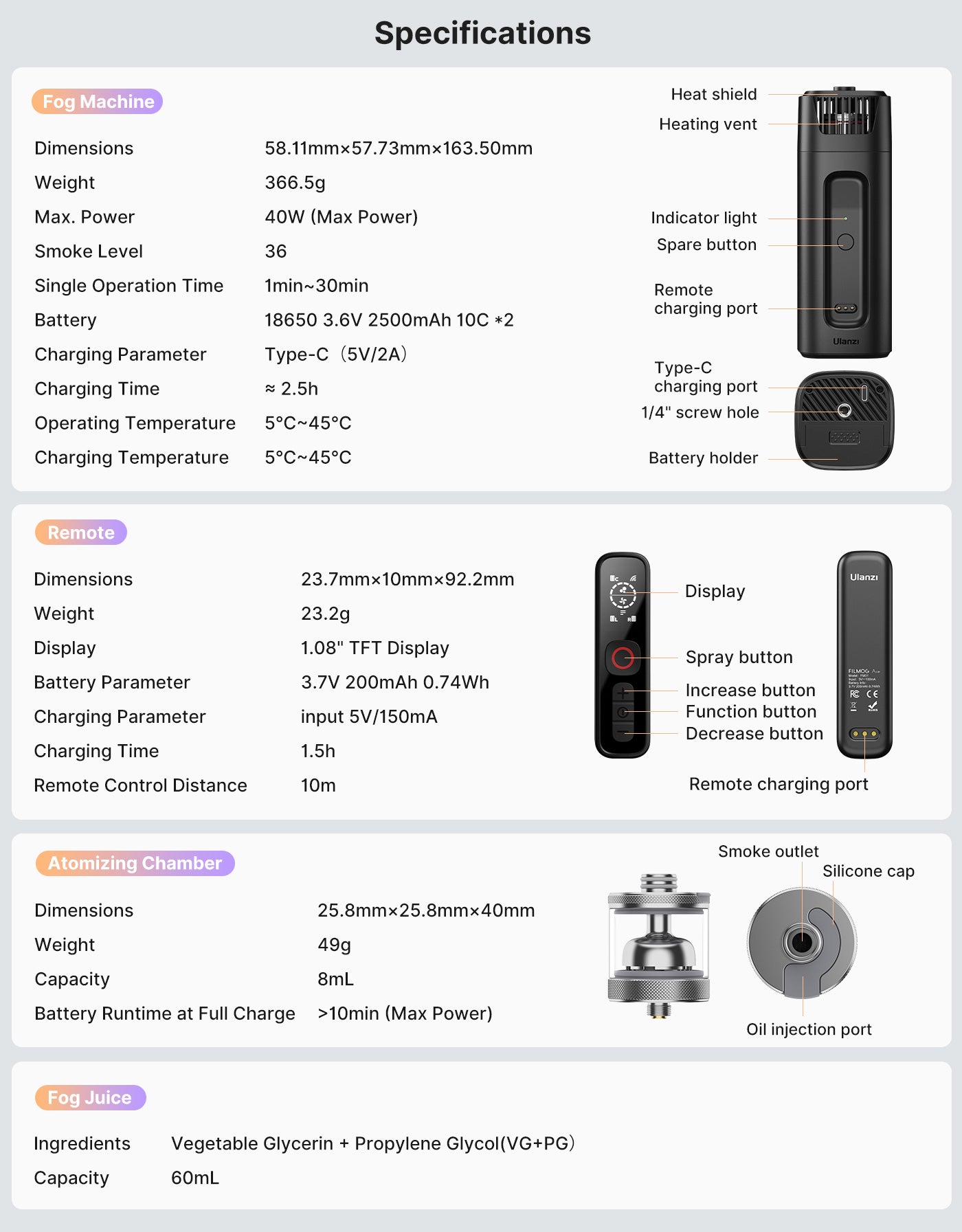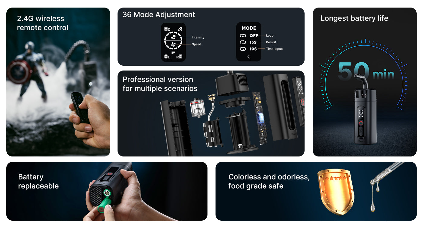 Ulanzi FM01 FILMOG Ace Přenosný mlhový stroj, kouřový stroj s 36 mlhovými efekty v různých intenzitách, 40W mlha s dálkovým ovládáním (až 10 metrů), přenosný ruční mlhový stroj, ideální pro fotografování, venkovní akce, večírky, jevištní efekty, Halloween nebo svatby.