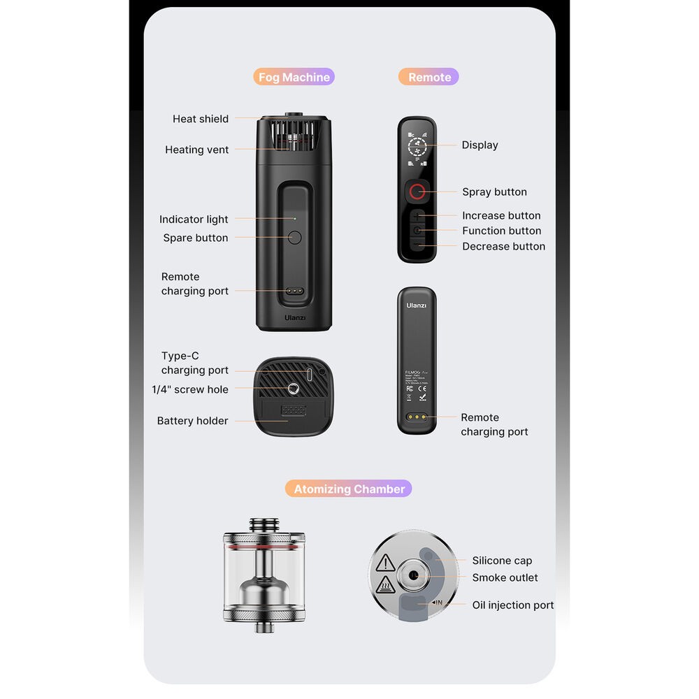 Přenosný mlhový generátor Ulanzi FM01 FILMOG Ace je kompaktní ruční mlhovač s 36 nastavitelnými režimy mlhy, bezdrátovým dálkovým ovládáním a nabíjecím portem USB-C. Je ideální pro fotografování, akce nebo jevištní efekty, je lehký, přenosný a obsahuje ochrannou tašku na přenášení. (Mlhová kapalina a baterie nejsou součástí balení.)