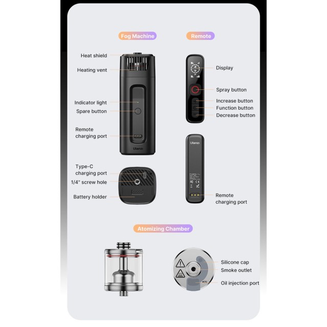FM01 má jednoduché rozhraní s barevným displejem, které umožňuje snadný výběr režimu a nastavení. Součástí balení je bezdrátové dálkové ovládání 2,4 GHz, které umožňuje uvolnění mlhy až ze vzdálenosti 10 metrů. Stroj je napájen dvěma bateriemi 18650 (nejsou součástí balení) nebo přes USB-C, což poskytuje flexibilní možnosti napájení a až 50 minut provozu.
