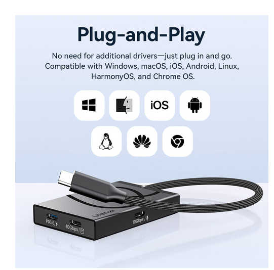 Rozbočovač Ulanzi M033 H1 4 v 1 USB-C Media Hub rozšiřuje možnosti vašeho systému a poskytuje nezbytné porty pro vysokorychlostní přenos dat, výstup videa a nabíjení. Tento kompaktní rozbočovač se připojuje k hostitelskému zařízení pomocí integrovaného opleteného kabelu USB-C 3.2 Gen 2 a nabízí rychlosti až 10 Gb/s. Zahrnuje dva porty USB-C 3.2 Gen 2 pro rychlý přenos dat, jeden port HDMI 2.0 podporující 4K video při 60 Hz pro vysoce kvalitní streamování a zobrazení a port USB-C Power Delivery 3.0 pro napájení zařízení na cestách. Navíc 1/4"-20 vnitřní závit v kombinaci s přiloženým adaptérem pro montáž na studený blesk umožňuje bezpečně připevnit hub k pouzdru fotoaparátu, což zajišťuje, že kabely zůstanou během používání připojené. Tento hub je kompatibilní s širokou škálou zařízení, včetně smartphonů, tabletů, počítačů a fotoaparátů, a je ideální pro tvůrce obsahu, streamery a profesionály, kteří potřebují spolehlivé připojení v přenosném balení.
