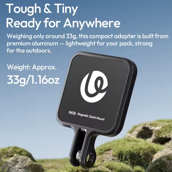 Magnetický adaptér Ulanzi IN08 pro GO Ultra je kompaktní a odolné řešení pro upevnění, určené k natáčení bez použití rukou. Díky silnému magnetickému spojení a lehké konstrukci z hliníkové slitiny umožňuje bezpečné připevnění k čelním páskům, držákům na krk a selfie tyčím – je ideální pro vlogování, jízdu na kole i každodenní dobrodružství.