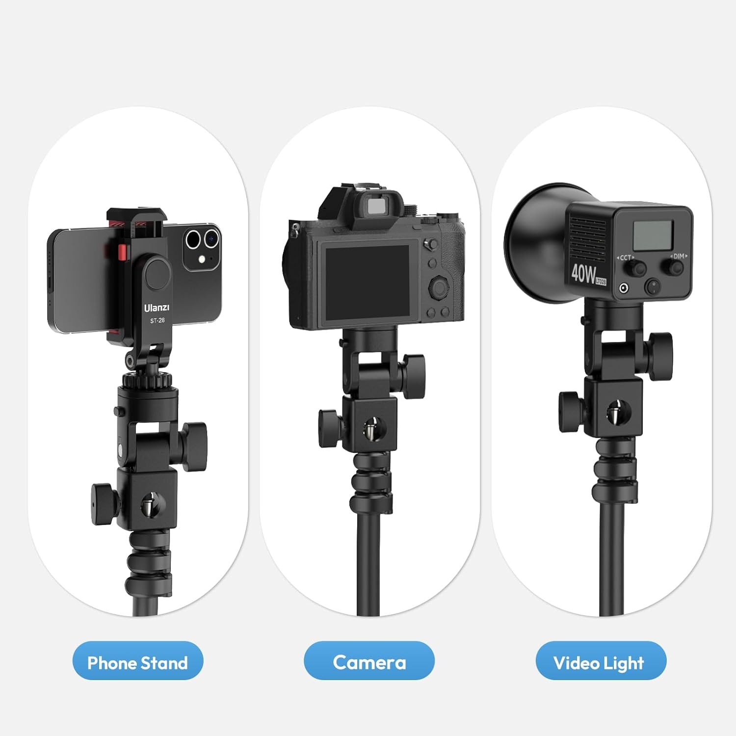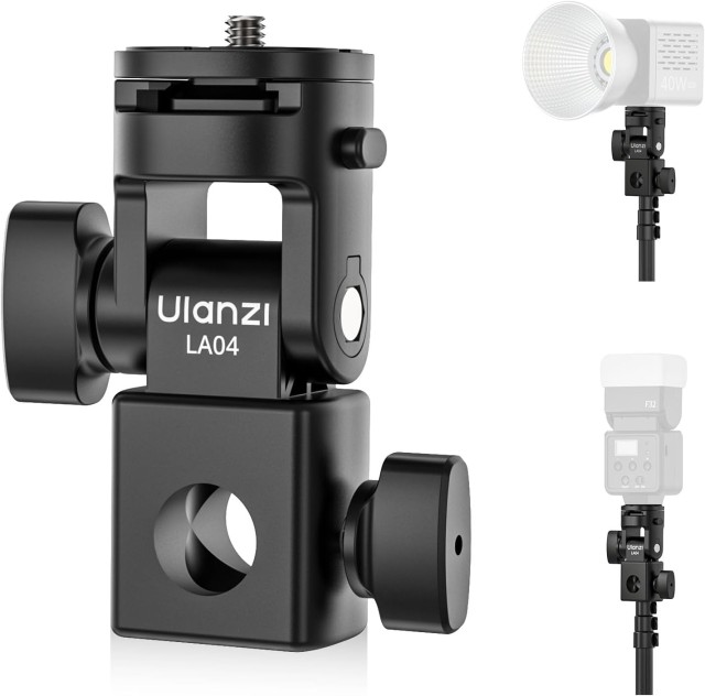 Adaptér na světelný stojan Ulanzi LA04 je kompaktní a univerzální příslušenství, které umožňuje připevnit fotoaparáty, držáky telefonů a videolampy ke standardním světelným stojanům. Díky 1/4" šroubu, držáku na studené patce a nastavení sklonu o 180° poskytuje flexibilní umístění pro fotografie a videa, přičemž zůstává lehký a přenosný.