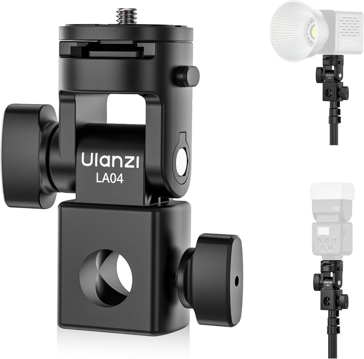 LA04 je navržen s ohledem na odolnost i přenosnost, je vyroben z odolných materiálů, ale váží pouze 100 g, což z něj činí ideální volbu pro tvůrce, kteří jsou často na cestách a potřebují spolehlivé vybavení, které nezabírá mnoho místa. Uzamykací knoflík pevně zajistí adaptér na jakémkoli světelném stojanu, takže můžete mít jistotu, že vaše zařízení zůstane během používání stabilní.