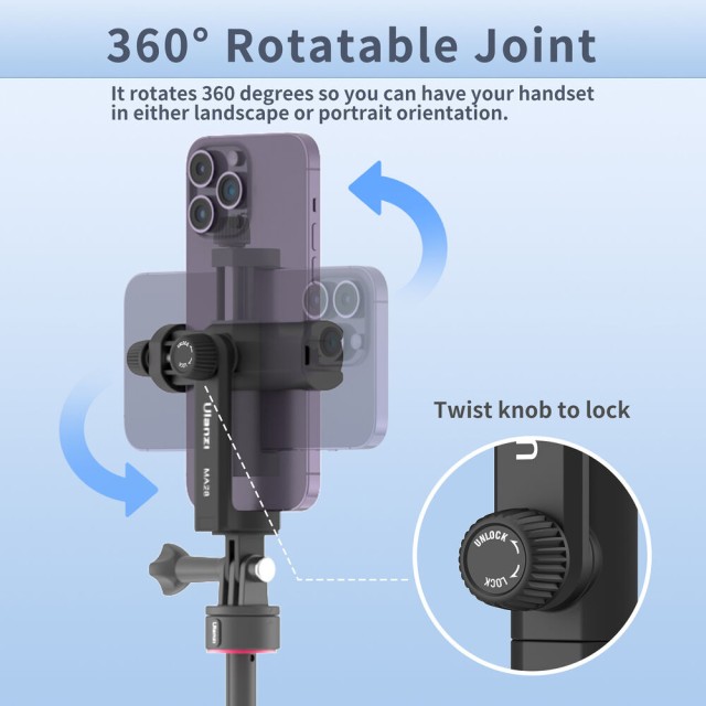 Nastavitelná svorka je vybavena silikonovými čelistmi a uzamykacím knoflíkem, které zajišťují, že váš telefon zůstane pevně na svém místě a zároveň je chráněn před poškrábáním nebo poškozením. Držák podporuje otáčení o 360° a naklonění až o 90°, což vám umožňuje rychle přepínat mezi orientací na výšku a na šířku a jemně doladit úhel natáčení.