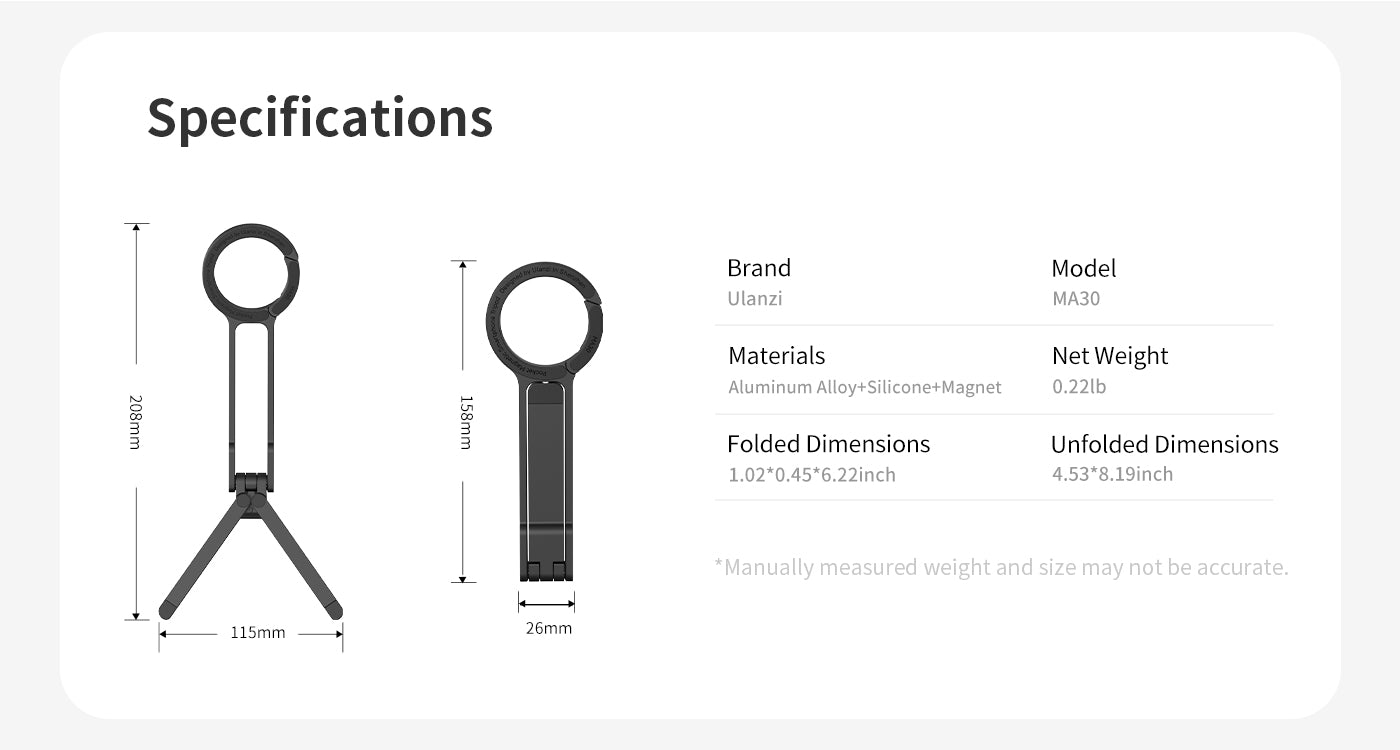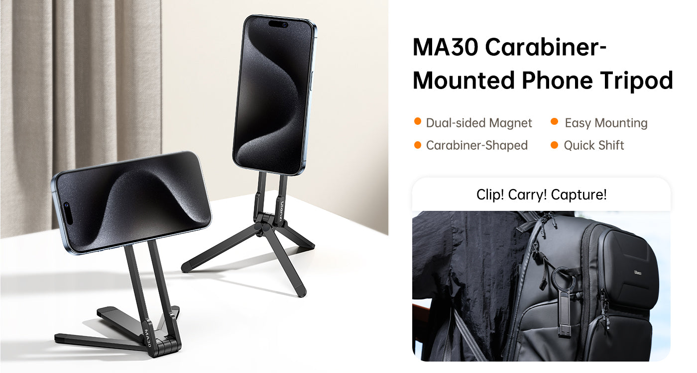 Stativ na telefon Ulanzi MA30 s karabinou – kompatibilní s MagSafe, ultra přenosný a vhodný pro tvůrce. Zavěste, sklopte, foťte. Ulanzi MA30 je stativ pro telefon ve tvaru karabiny určený pro tvůrce, kteří potřebují rychlé nastavení, flexibilní úhly a kompaktní přenosnost. Ať už natáčíte vlog na cestách nebo filmujete v omezených prostorech, tento držák kompatibilní s MagSafe je připraven k připnutí a natáčení.