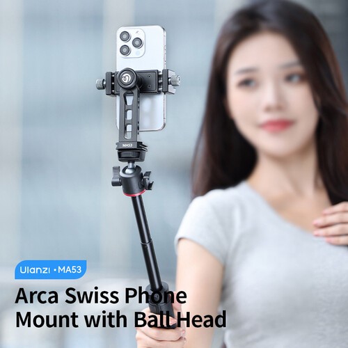 Držák na telefon Ulanzi MA53 Arca Swiss je robustní hliníkový držák na smartphone s integrovanou kulovou hlavou a rychloupínací základnou typu Arca. Je určen pro telefony o šířce 2,4–3,7 palce a nabízí plynulou rotaci o 360°, polohování v několika úhlech a rozsáhlé možnosti rozšíření o příslušenství – ideální pro mobilní natáčení filmů, živé vysílání a fotografování.