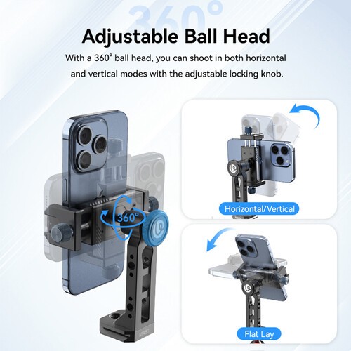Držák na telefon Ulanzi MA53 Ball Head Phone Mount nabízí profesionální flexibilitu a stabilitu pro tvůrce obsahu na smartphonech. Tento držák je vyroben z odolného hliníku a pomocí silikonových čelistí, které chrání vaše zařízení před poškrábáním a nechtěným pohybem, bezpečně upevní smartphony o šířce 2,4 až 3,7 palce.