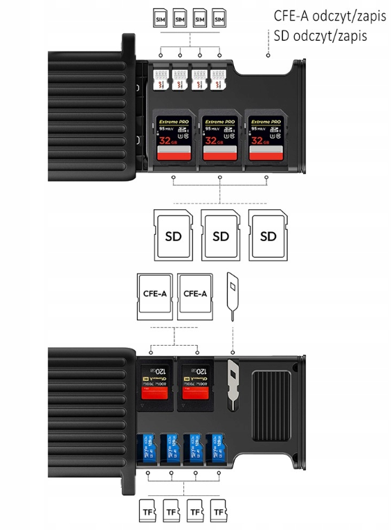All-in-one pouzdro na paměťové karty s vestavěnou čtečkou karet