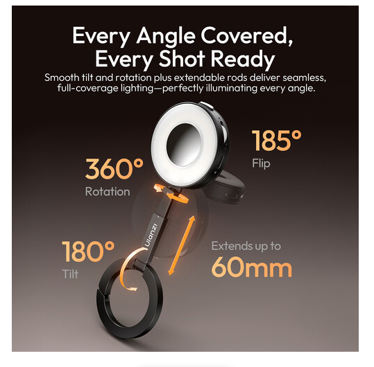 Ulanzi ML05 MagLock Fill Light je dokonalý nástroj pro vylepšení fotografování smartphonem, vlogování a tvorbu obsahu. Jeho kompaktní design se magneticky připevňuje k jakémukoli zařízení nebo pouzdru kompatibilnímu s MagSafe, zatímco vestavěná výsuvná tyč umožňuje naklánění, otáčení nebo použití jako stojan či rukojeť pro lepší ergonomii.