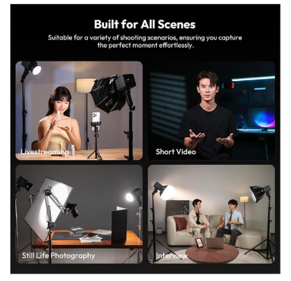 Vestavěná lithiová baterie s kapacitou 111 Wh umožňuje skutečně bezdrátový provoz a poskytuje až 8 hodin provozu při minimálním jasu nebo 50 minut při plném výkonu, což je ideální pro natáčení na místě bez nutnosti externího napájení. Světlo také podporuje napájení DC a USB-C PD (100 W), což zajišťuje flexibilní nabíjení a nepřetržité používání v případě potřeby.