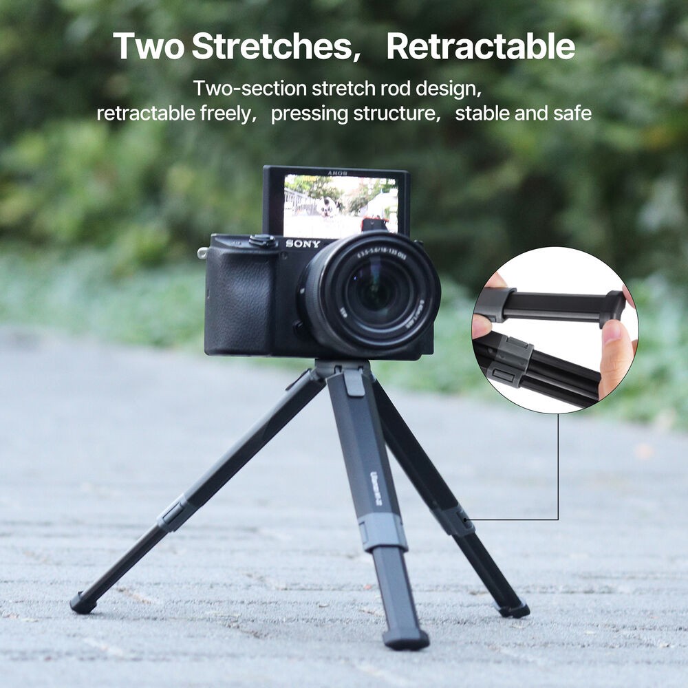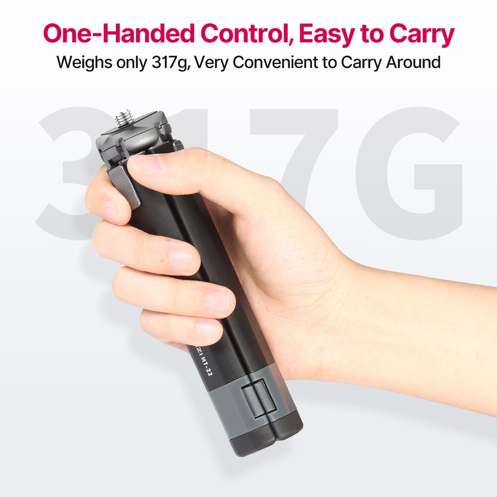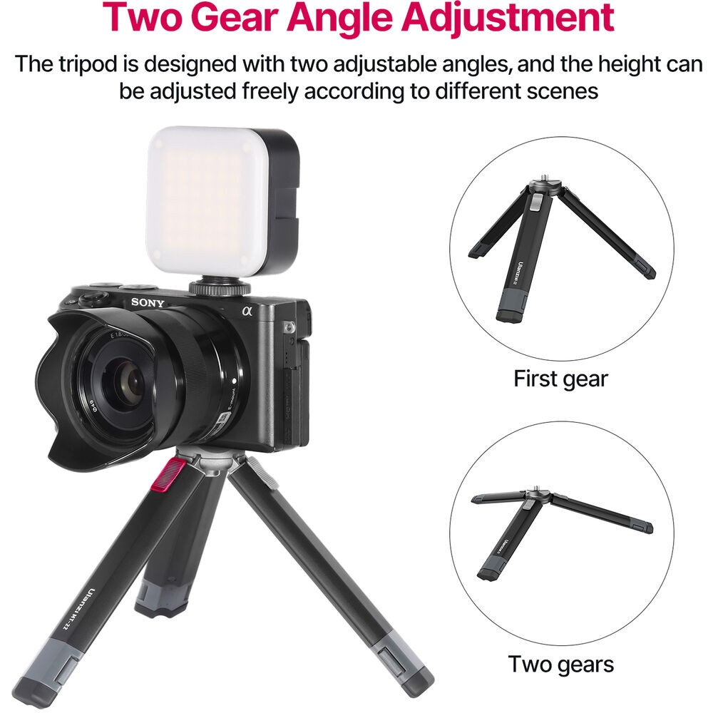 Ulanzi MT-22 je kompaktní, celokovový mini stativ s 1/4"-20 úchytem, který unese až 2,5 kg (5,5 lb). Jeho dvoudílné výsuvné nohy umožňují rychlé nastavení, nastavitelné úhly a snímky s nízkou perspektivou, což jej činí ideálním pro akční kamery, kompaktní bezzrcadlovky nebo webové kamery.