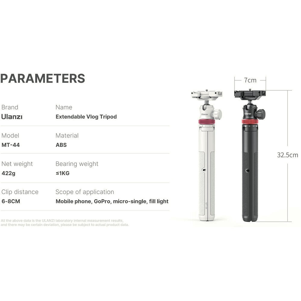 Roztažitelný stativ Ulanzi MT-44 Extendable Vlog Tripod (bílý) V2 je určen pro vlogery, tvůrce obsahu a cestovatele, kteří potřebují kompaktní, ale univerzální stativ. Jeho 6dílný hliníkový středový sloupek s otočným zámkem se dá vysunout z 35 cm na 149 cm, takže jej lze použít jako stolní stativ, plnohodnotný stativ nebo selfie tyč. Váží pouze 422 g, takže se snadno přenáší, ale přesto unese zařízení o hmotnosti až 1 kg.