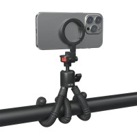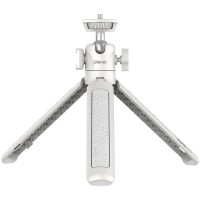 Integrovaná kulová hlava je vybavena sklopnou svorkou pro smartphony kompatibilní se zařízeními o šířce 6–8 cm a montážním šroubem 1/4"-20 pro malé fotoaparáty. Nohy stativu se sklopí do pohodlné rukojeti pro ruční fotografování, zatímco protiskluzové podložky na nohách zvyšují stabilitu a ovladatelnost. Díky své lehké a kompaktní konstrukci je ideální pro webcasting, cestovní videa, selfie a živé vysílání.