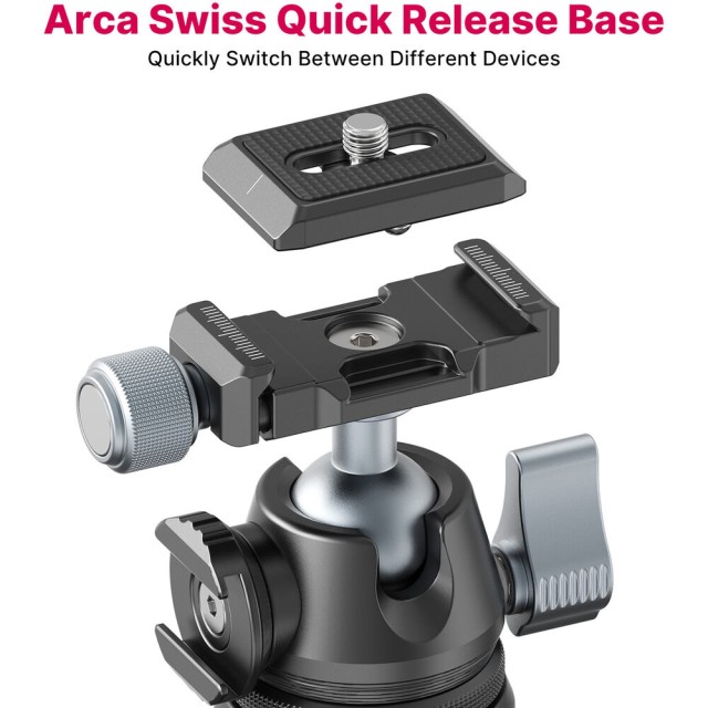 Integrovaná kulová hlava umožňuje plynulou 360° panoramatickou rotaci a 90° vertikální naklonění, což umožňuje rychlý přechod mezi orientací na šířku a na výšku. Jediná zajišťovací páčka umožňuje rychlé a intuitivní nastavení. Výjimečnou vlastností je tenká rychloupínací deska typu Arca, která umožňuje rychlé připevnění a sejmutí fotoaparátu bez použití nástrojů. Otočný držák s cold shoe navíc umožňuje připevnit příslušenství, jako jsou mikrofony, LED světla nebo monitory, a vytvořit tak kompaktní profesionální fotografickou soupravu.