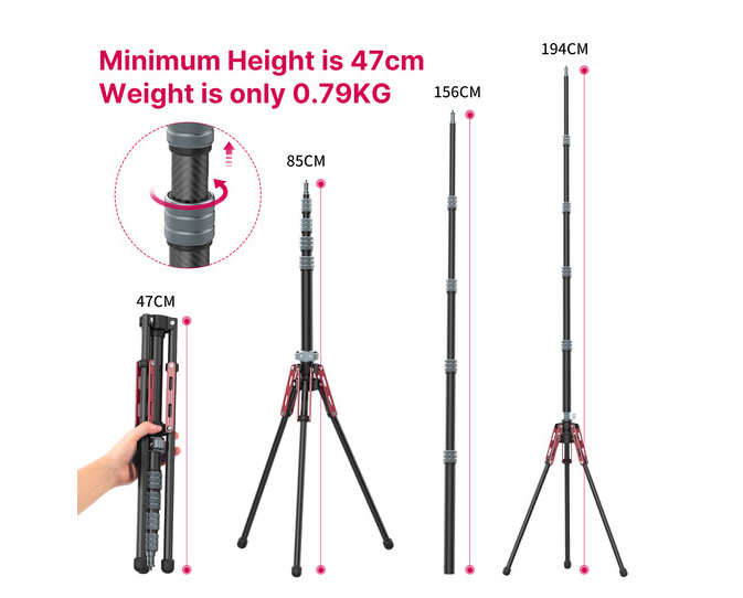 Přenosný světelný stojan / kamerový stativ Ulanzi MT-49 z uhlíkových vláken (1,9 m) je lehká, ale odolná podpůrná konstrukce určená pro fotografy a kameramany, kteří jsou často na cestách. Díky konstrukci z uhlíkových vláken unese až 6 kg a lze jej vysunout na délku 1,94 m; pro snadnou přepravu se dá kompaktně složit. Díky odnímatelnému středovému sloupku, který lze přeměnit na monopod, nabízí vynikající univerzálnost jak pro studiové, tak pro venkovní natáčení.