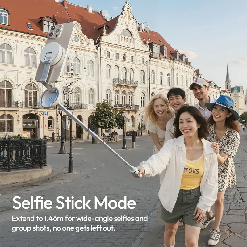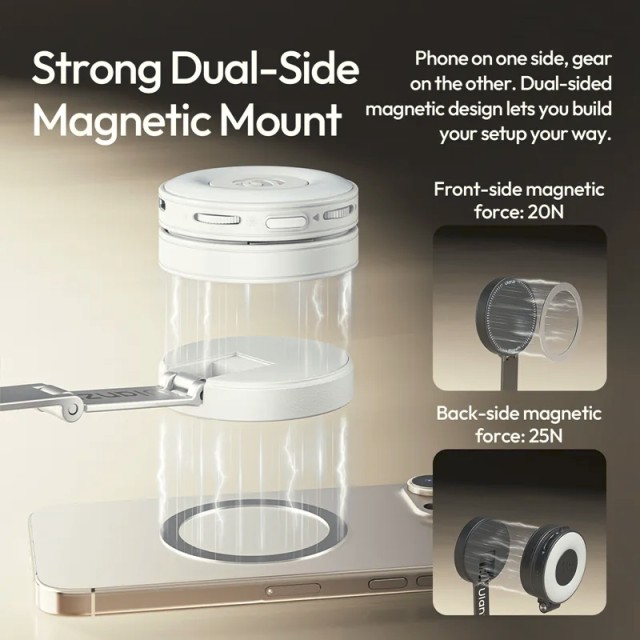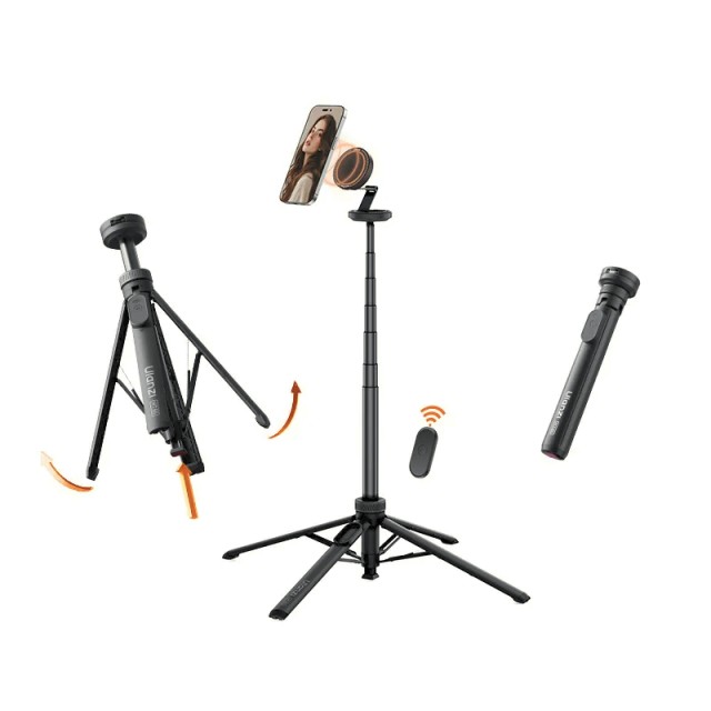 Ulanzi MT85 je automatický stativ pro telefon s oboustranným magnetickým držákem kompatibilním s MagSafe. Jeho čtyřnohá konstrukce zajišťuje stabilitu, lze jej vysunout až na 1,5 m a obsahuje Bluetooth dálkové ovládání pro fotografování bez použití rukou. Je kompaktní a přenosný, takže je ideální pro selfie, celkové snímky, živé vysílání a tvorbu obsahu.