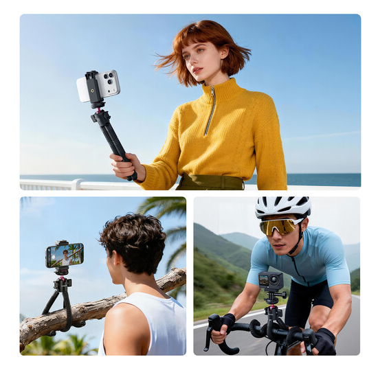 Jeho tři flexibilní, vodotěsné a korozivzdorné nohy lze omotat kolem sloupů, zábradlí, větví nebo nerovných povrchů, což uživatelům umožňuje natáčet z jedinečných a kreativních úhlů, kde nelze použít standardní stativy. Díky tomu je obzvláště užitečný pro natáčení venku, cestovatelský obsah a dynamická vlogovací nastavení.