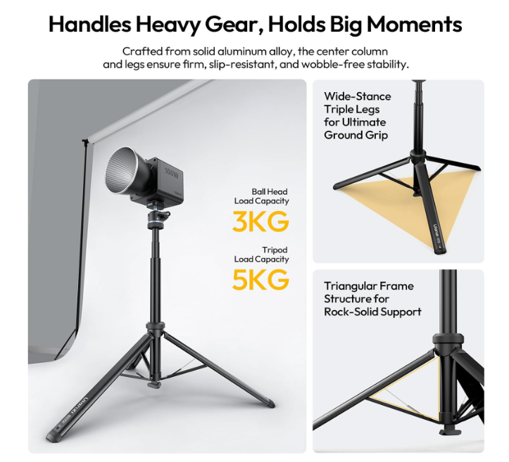 MT93 je vyroben z odolné hliníkové slitiny a poskytuje výjimečnou stabilitu a pevnost. Unese až 5 kg na stativu a 3 kg na kulové hlavě. Jeho 5dílný středový sloupek umožňuje plynulé nastavení výšky až do 1,6 metru (63 palců), což vám dává plnou kontrolu nad záběry z nízkého i vysokého úhlu.