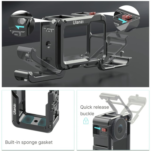 Chraňte a rozšiřte funkčnost své kamery DJI Osmo Action 3 nebo Action 4 pomocí kovového krytu Ulanzi OA-14 C-Action. Tento lehký kryt je vyroben z odolné hliníkové slitiny, váží pouze 87 g a poskytuje bezpečné uchycení pro vaši akční kameru. Díky několika otvorům se závitem 1/4"-20 a držákům pro studené boty můžete připojit mikrofony, LED světla nebo jiné příslušenství a vytvořit tak profesionální sestavu pro natáčení. Konstrukce zajišťuje, že základní porty a tlačítka – včetně portu Type-C, krytu baterie, reproduktoru a přepínače – zůstávají plně přístupné, takže můžete rychle vyměnit baterii nebo ji nabít, aniž byste museli klec sundávat. OA-14 je také vybaven rychloupínacím zámkem pro rychlou instalaci a demontáž a spodní sklopný port poskytuje další možnosti upevnění při zachování struktury portu DJI Action. Plynule přepínejte mezi horizontálním a vertikálním natáčením, abyste pokaždé zachytili perfektní úhel.