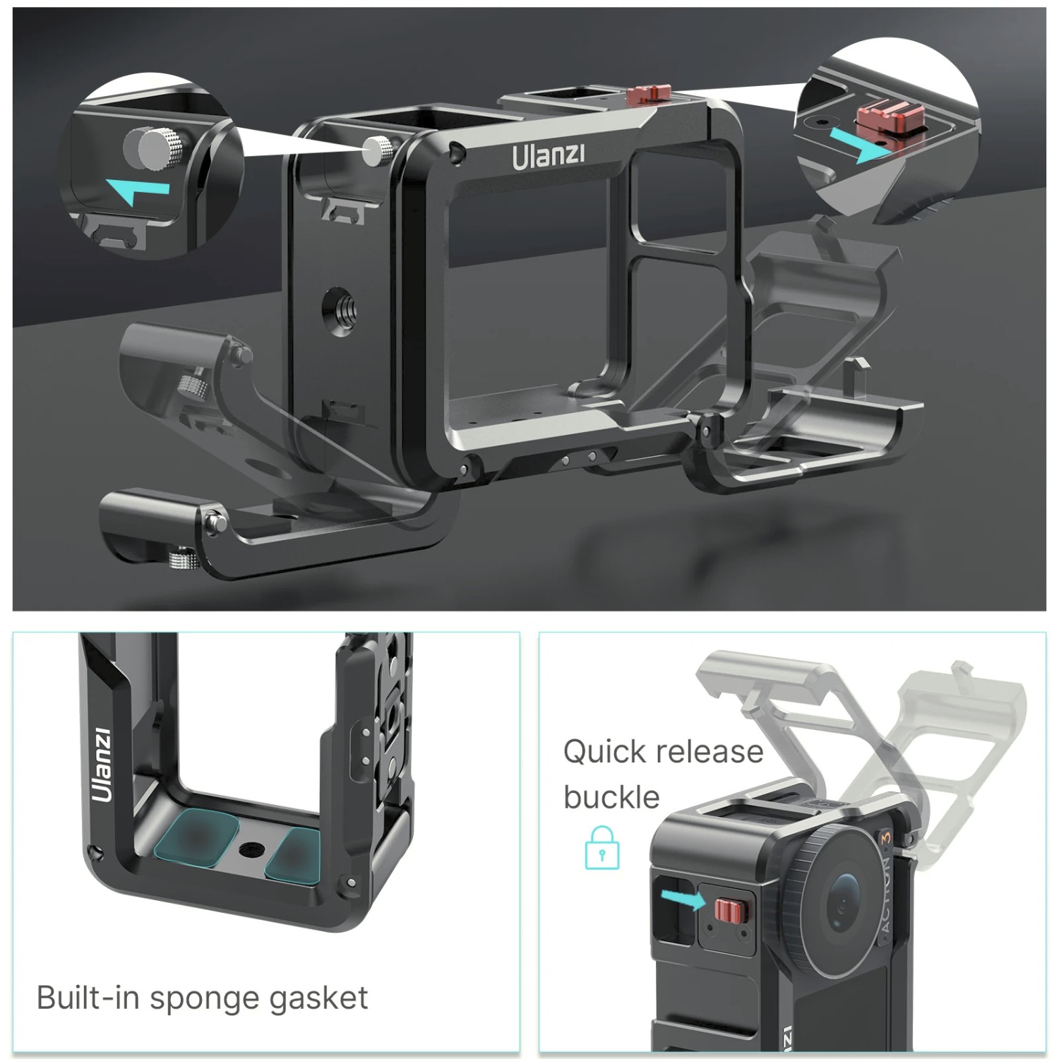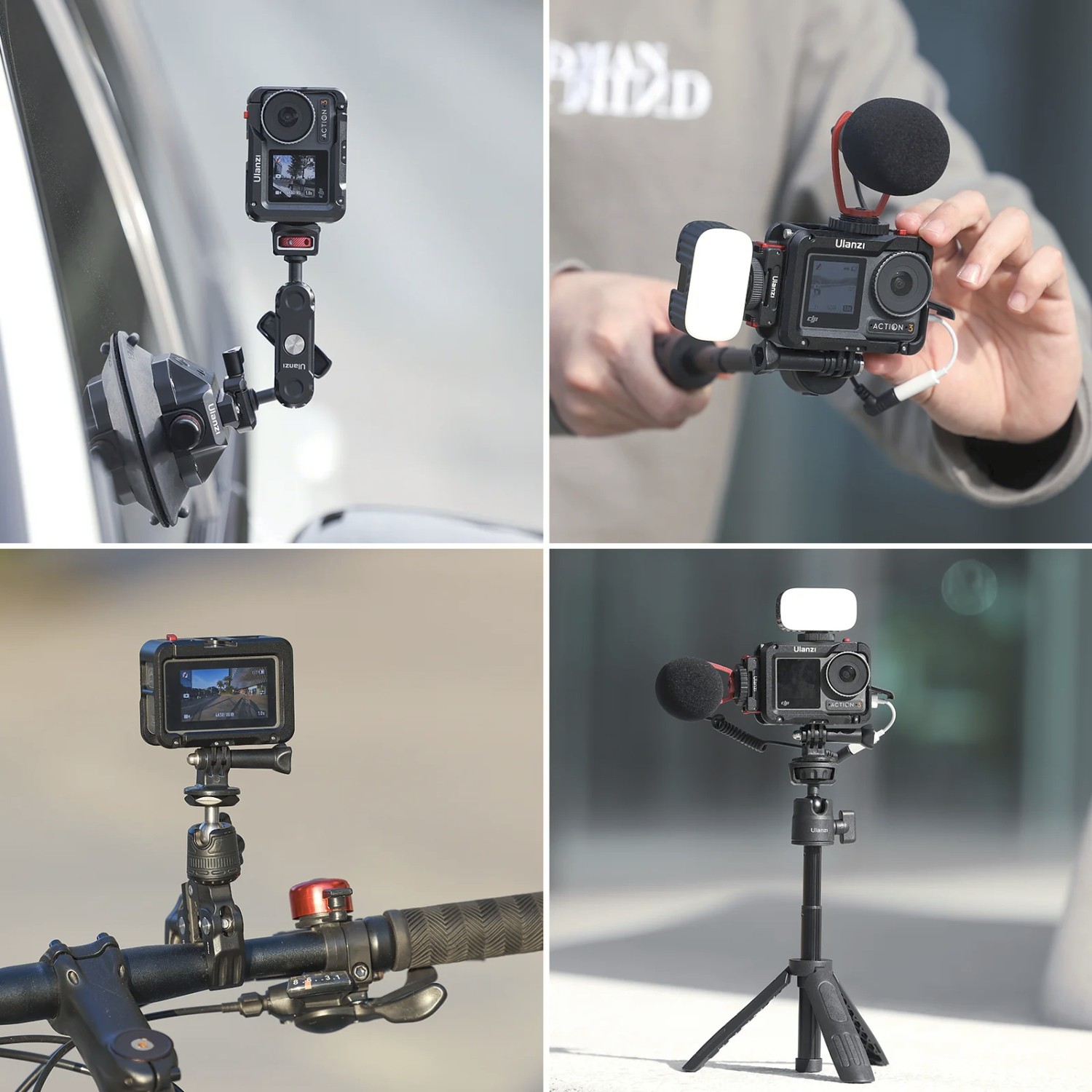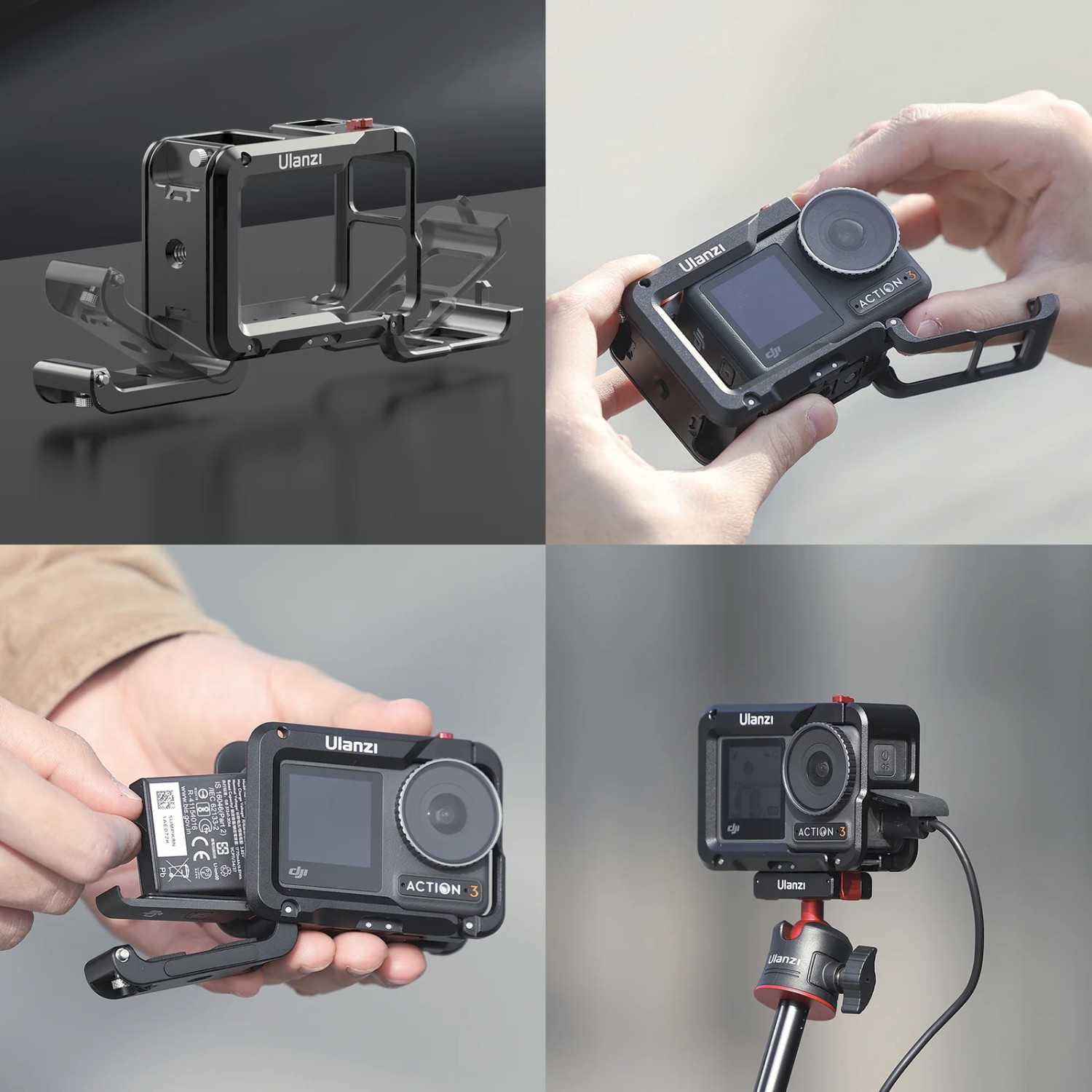 Kovový držák kamery Ulanzi OA-14 C-Action je odolný a univerzální držák určený pro DJI Osmo Action 3 a Action 4. Nabízí několik možností upevnění mikrofonů, světel a dalšího příslušenství a umožňuje snadné přepínání mezi horizontálním a vertikálním režimem natáčení.