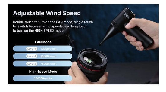 Výkonný elektrický vzduchový čistič Ulanzi je kompaktní 2v1 zařízení, které slouží jako foukač vzduchu i vysavač. Je určeno k účinnému čištění fotoaparátů, klávesnic, počítačů a studiové techniky. Disponuje nastavitelnou rychlostí a bezdrátovým provozem.