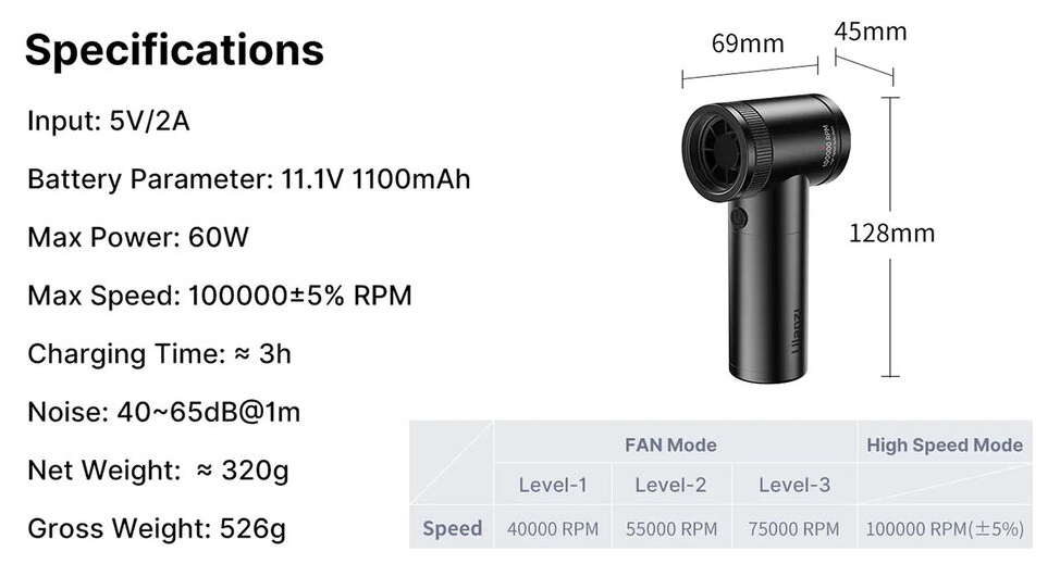 Vysavač je vybaven čtyřmi nastavitelnými rychlostmi, které umožňují přesné ovládání pro různé úklidové úkoly – od citlivého fotografického vybavení po klávesnice, komponenty počítačů a vybavení psacích stolů. Výkonný motor poskytuje otáčky v rozmezí 40 000 až 100 000 otáček za minutu, což zajišťuje efektivní úklidový výkon.
