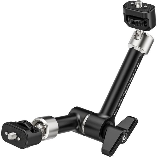 10" kloubové rameno je vybaveno dvěma 360° nastavitelnými kulovými hlavami se šrouby 1/4"-20 na každém konci, které poskytují plnou svobodu při naklánění, otáčení a nastavování připojených zařízení. S nosností až 6,6 lb může bezpečně držet světla, monitory, mikrofony nebo kamery. Nezávislé uzamykací knoflíky a pojistné kolíky zajišťují, že vaše zařízení zůstane během používání bezpečně upevněno, zatímco konstrukce z hliníkové slitiny a nerezové oceli poskytuje odolnost bez nadměrné hmotnosti.